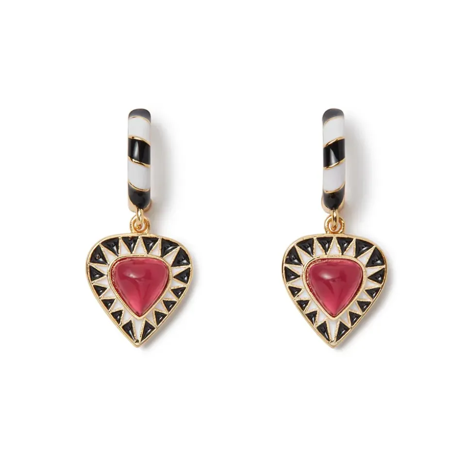 These Head-Turning Huggie Earrings Reinterpret A Pair Of Remarkable Gold, Stone, And Glass Earrings (3Rd–2Nd Century B.C.) From Hellenistic Greece In The Museum’S Holdings. Egyptian Influences Became Fashionable In Greek Jewelry During Egypt’S Ptolemaic Reign (323–31 B.C.), As Exemplified In Some Of The Detailing On These Spectacular Adornments In The Met Collection. Among Their Many Components Is An Egyptianized Atef Crown—A Tall Headdress Typically Worn By The God Osiris—Made Of A Sun Disk In A Translucent Stone Surmounted By Twin Feathers Of Opaque Black-And-White Glass; And A Heart-Shaped Pendant With A Red Stone, Bordered By A Black-And-White Sawtooth Design.