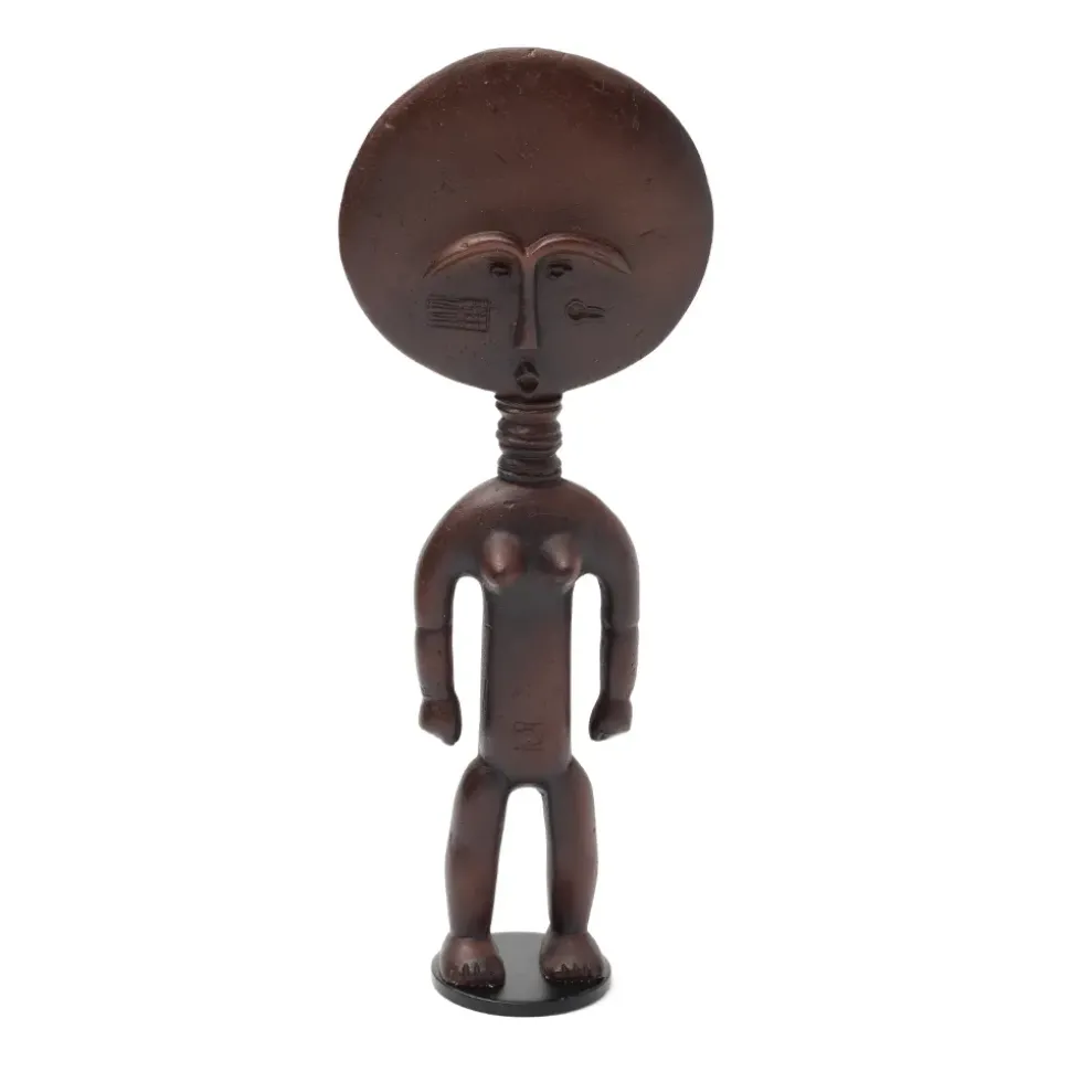 This Small Resin Reproduction Depicts An Akua Ba Figure, One Of The Most Recognizable Forms In African Art. Consecrated By Priests, Such Figures Are Carried By Women Who Hope To Conceive A Child. The Flat, Disk-Like Head Is An Exaggerated Convention Of The Akan Ideal Of Beauty, While The Sculpture’S Flattened Shape Allows It To Be Carried Against A Woman’S Back, Wrapped In Her Skirt. The Rings On The Figure’S Neck Signify Beauty, Health, And Prosperity In Akan Culture.
