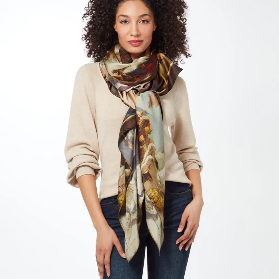 Bring The Drama With This Artful Scarf Featuring A Fabulous Tableau By The Great Giovanni Battista Tiepolo (Italian, 1696–1770). Regarded As The First Master Of The Grand Manner—A Style Of Painting Then Celebrated For Its Idealized, Often Classical Motifs—Tiepolo Was Arguably The Most Outstanding Painter Of 18Th-Century Europe. Allegory Of The Planets And Continents (1752) Ranks Among His Largest And Most Dazzling Oil Sketches, In Which A Radiant Apollo, The God Of Light, Is Set To Launch On His Daily Course Across The Sky. The Deities Around Apollo Symbolize The Planets, While The Allegorical Figures On The Cornice Represent The “Four Continents,” Which Included Europe, Africa, Asia And America At The Time. Tiepolo Presented This Preliminary Sketch To The Prince-Bishop Of Würzburg As His Proposal For A Palace Fresco. The Finished Work Is Often Considered Tiepolo’S Greatest Achievement.